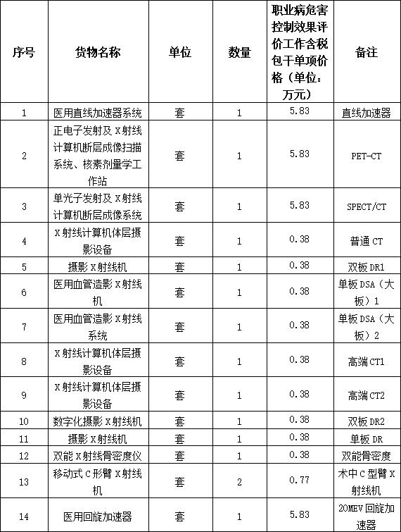 1.1.2服務(wù)內(nèi)容: 綿陽三江醫(yī)院項(xiàng)目(一期)職業(yè)病危害控制效果評價(jià)工作全部工作內(nèi)容:進(jìn)行現(xiàn)場驗(yàn)收檢測并編制職業(yè)病危害放射防護(hù)控制效果評價(jià)工作報(bào)告書,協(xié)調(diào)市衛(wèi)健部門召開職業(yè)病危害控制效果評價(jià)工作報(bào)告專家審核會(huì)議,通過專家評審,并最終取得批復(fù)。具體設(shè)備如下: