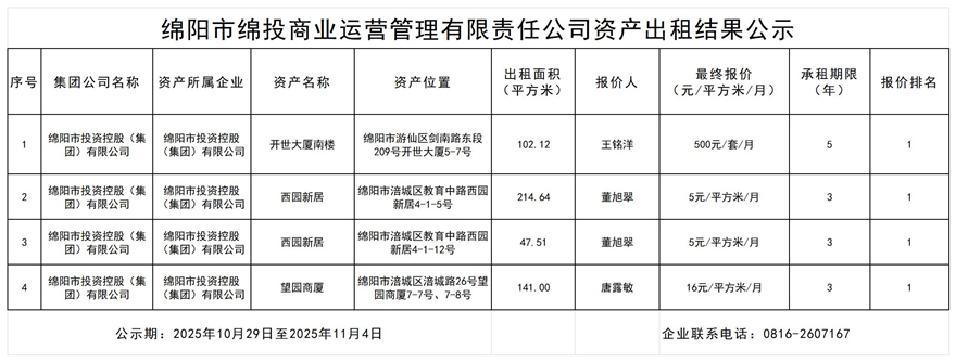 綿陽(yáng)市綿投商業(yè)運(yùn)營(yíng)管理有限責(zé)任公司資產(chǎn)出租結(jié)果公示