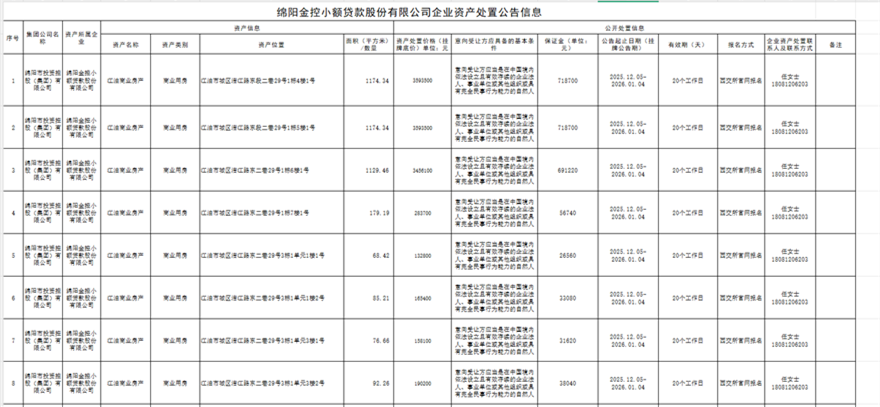 綿陽(yáng)金控小額貸款股份有限公司企業(yè)資產(chǎn)處置公告信息