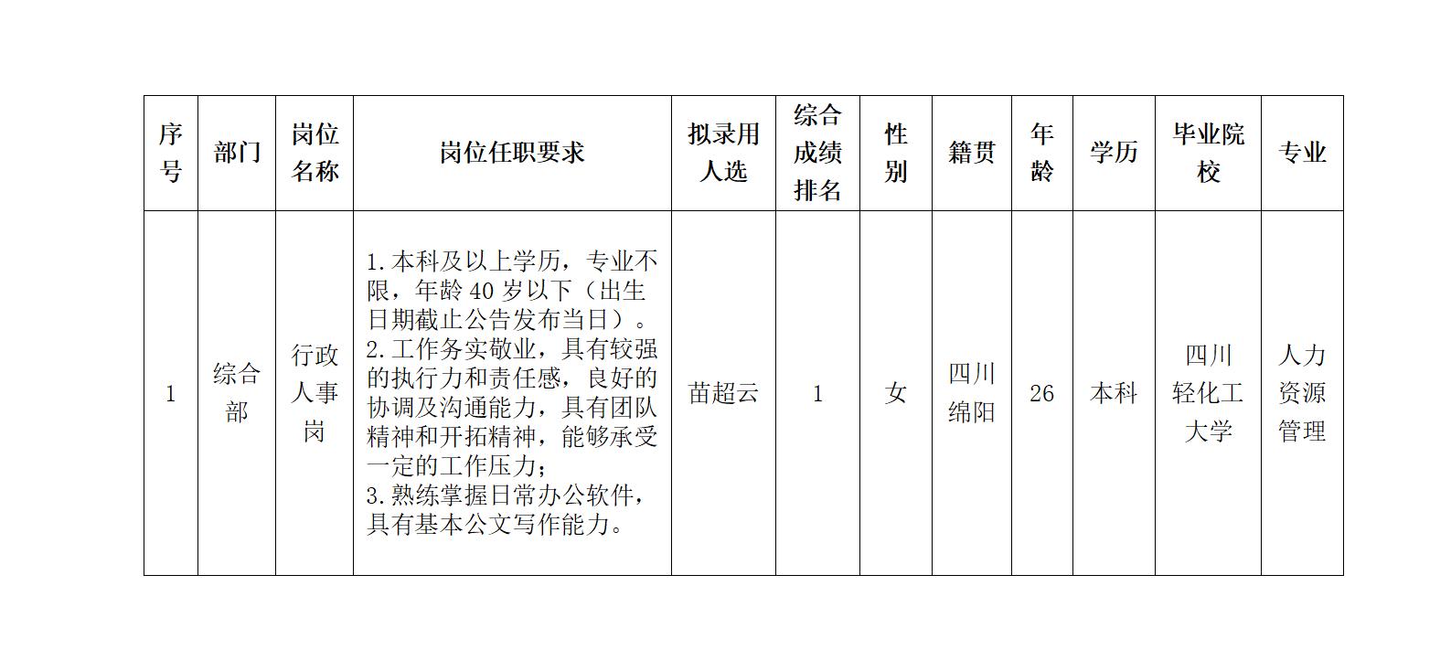 根據四川綿江能源有限公司發(fā)布的招聘公告及招聘相關規(guī)定,經筆試、面試、考察、體檢等程序,擬錄用苗超云同志到四川綿江能源有限公司工作,現予以公示,具體情況如下: