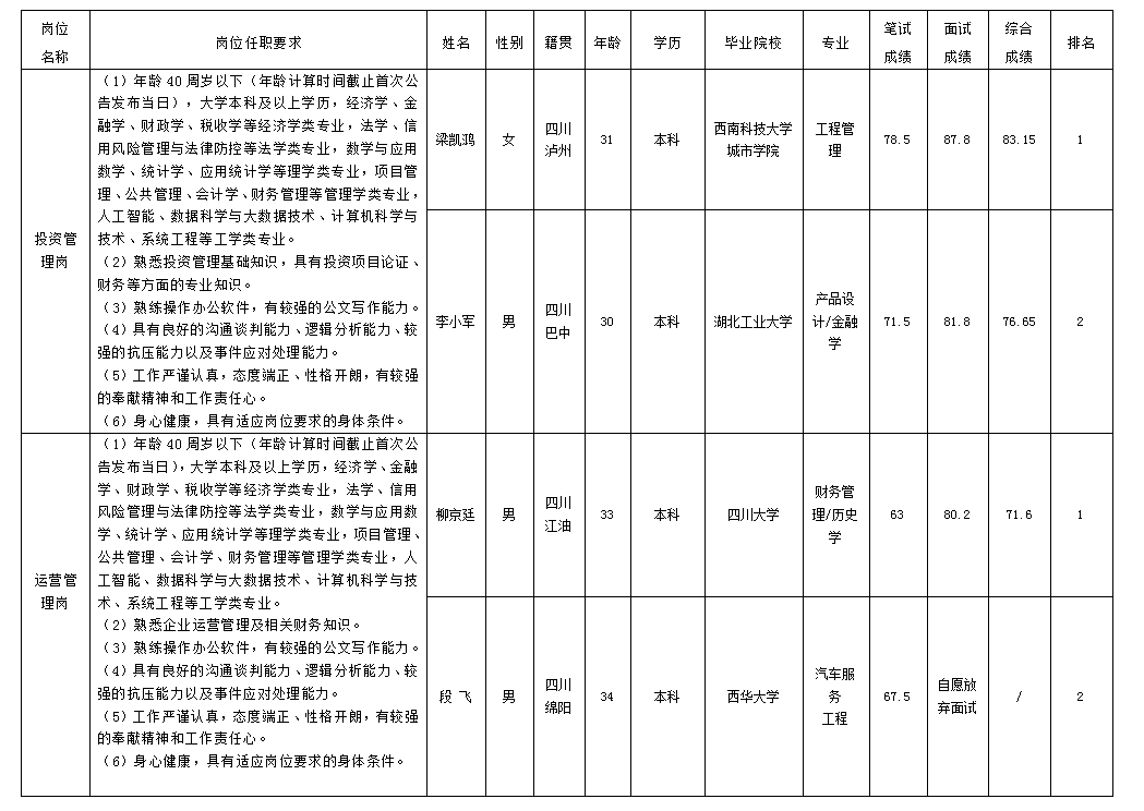 根據綿陽市投資控股(集團)有限公司發(fā)布的招聘公告及招聘相關規(guī)定,經筆試、面試等程序,現(xiàn)將筆試(面試)成績予以公示。
